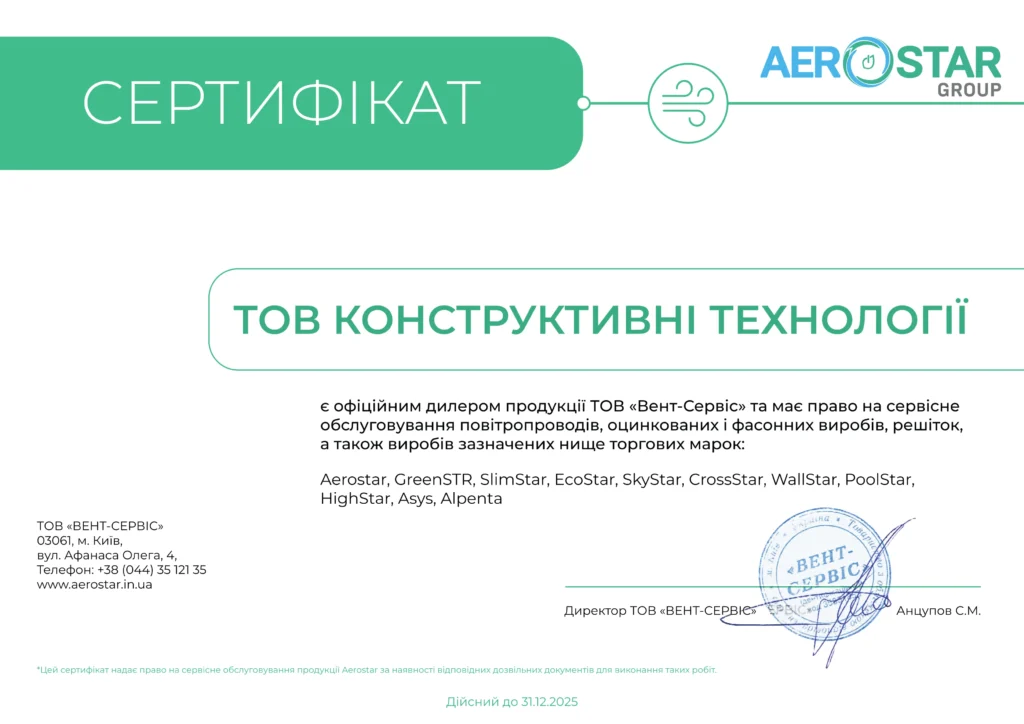 Сертифікат засвідчує, що ТОВ “Конструктивні технології” є офіційним дилером продукції ТОВ “ВЕНТ-СЕРВІС” та має право на сервісне обслуговування повітроводів, оцинкованих та фасонних виробів, грат, а також обладнання торгових марок:
